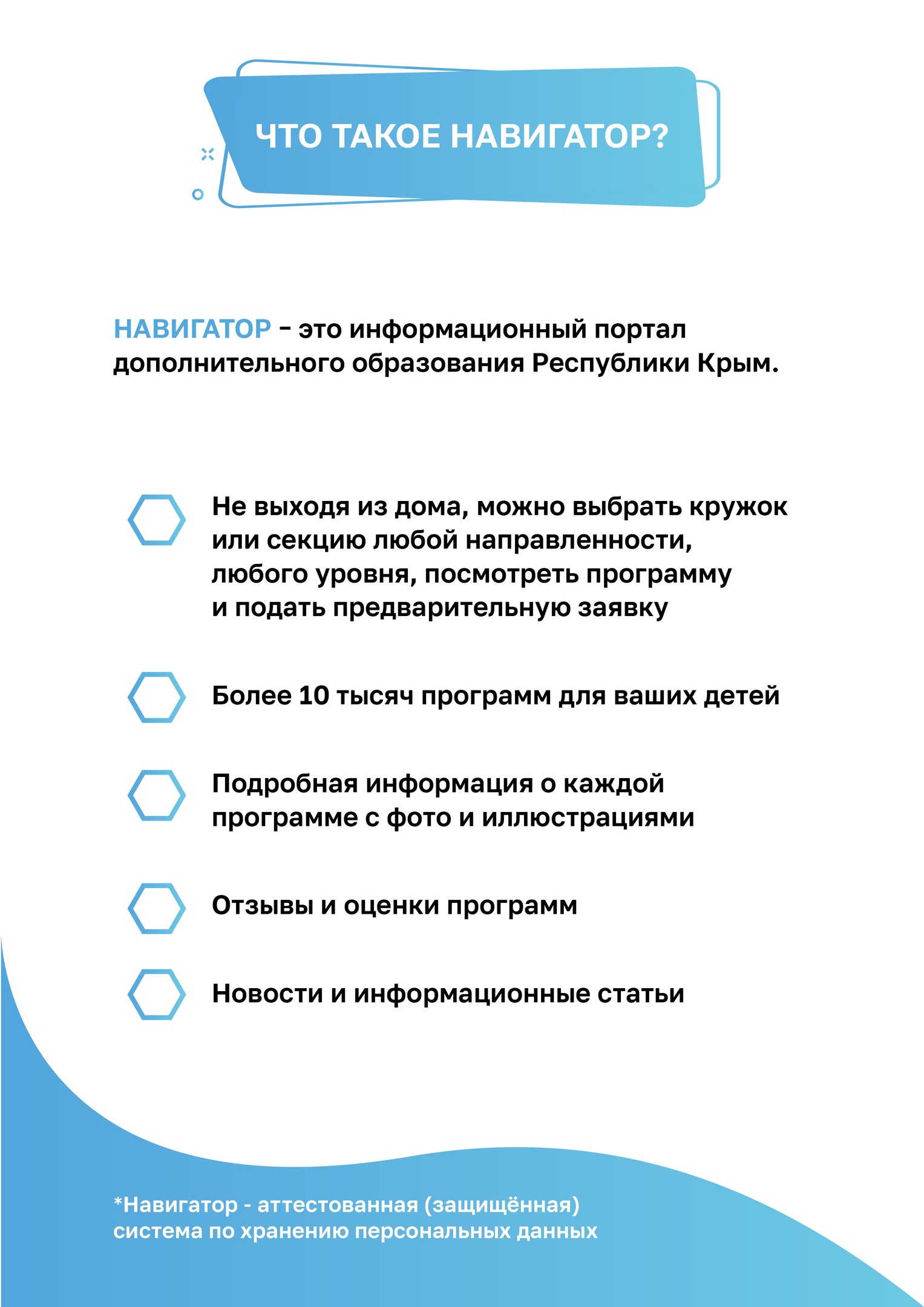 Навигатор дополнительного образования Республики Крым – информационный ресурс для родителей, который поможет найти творческое объединение, кружок, секцию для развития способностей ребенка в возрасте от 5 до 18 лет. На информационном портале Навигатора можно увидеть перечень всех программ и записаться в понравившееся творческое объединение.